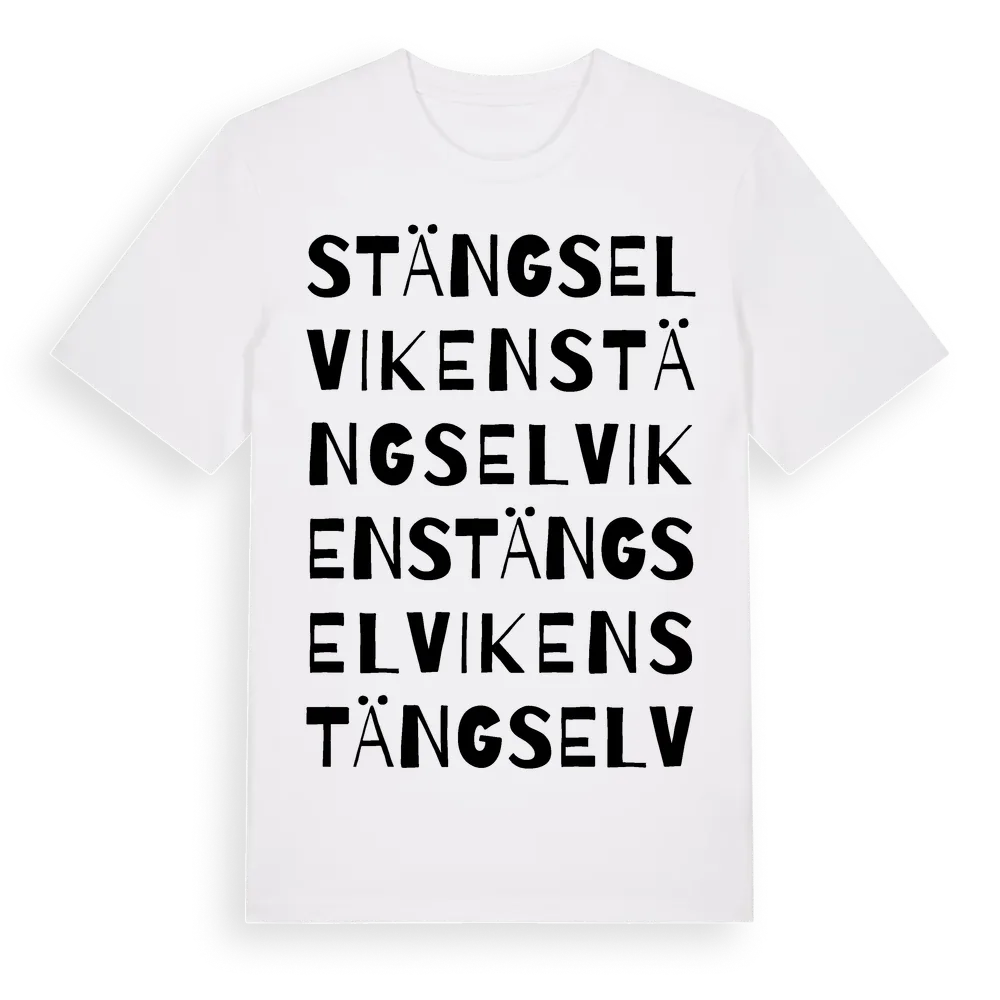 Stängselviken ordlek t-shirt är inspirerad av Stängselviken i Västerbottens län, Sverige. Tröjan är designad för dig som har en speciell koppling till platsen – oavsett om du bor här, har rötterna här eller bara älskar Stängselviken.