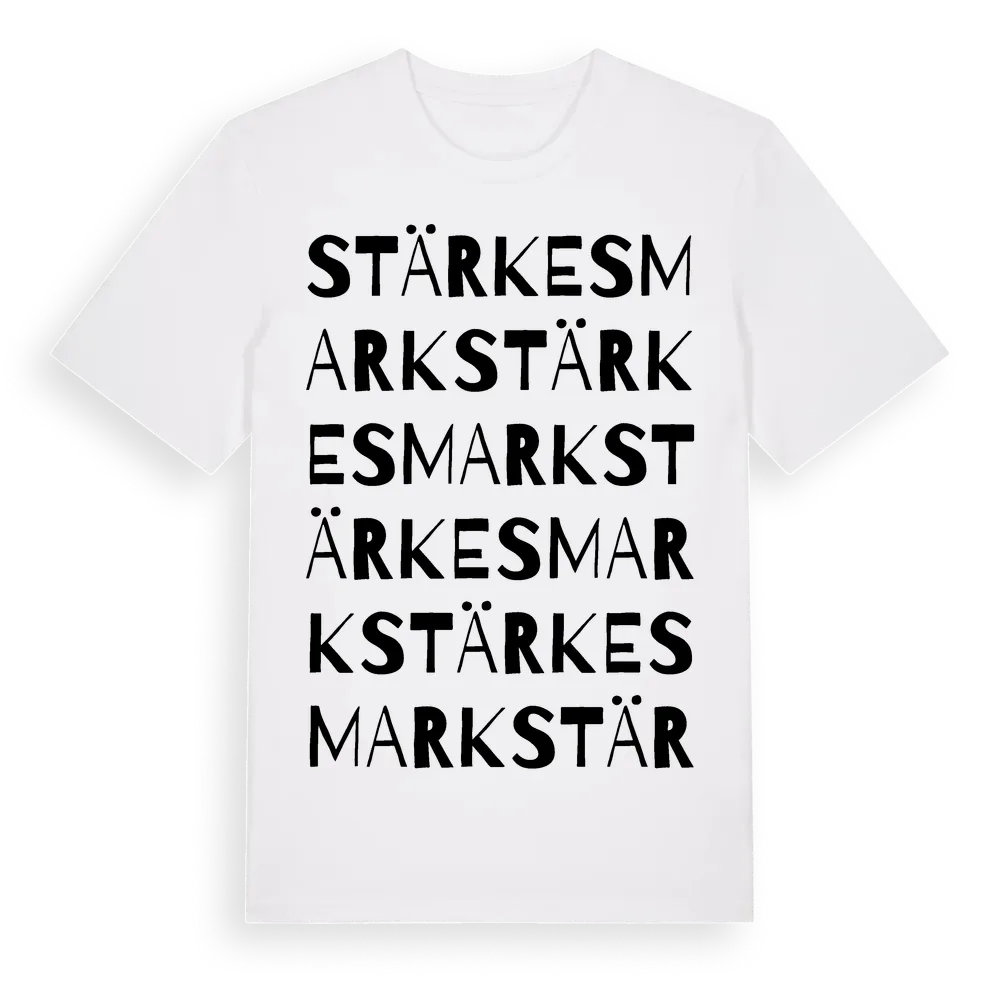 Stärkesmark ordlek t-shirt är inspirerad av byn Stärkesmark i Västerbottens län, Sverige. Tröjan är designad för dig som har en speciell koppling till platsen – oavsett om du bor här, har rötterna här eller bara älskar Stärkesmark.
