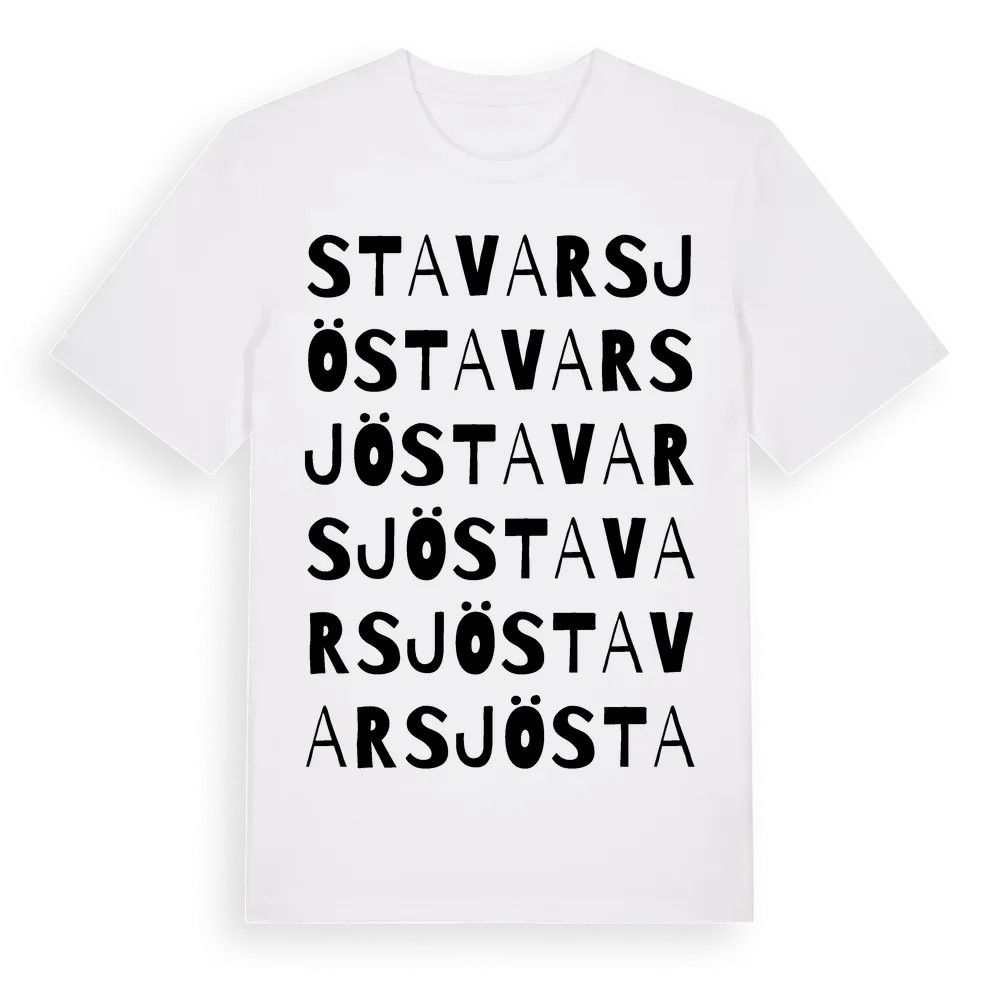 Stavarsjö ordlek t-shirt är inspirerad av Stavarsjö i Västerbottens län, Sverige. Tröjan är designad för dig som har en speciell koppling till platsen – oavsett om du bor här, har rötterna här eller bara älskar Stavarsjö.