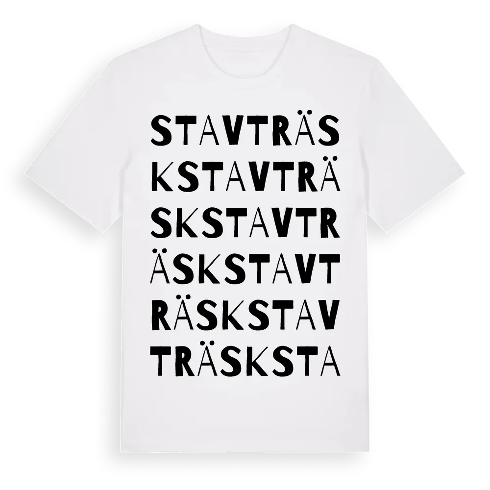 Stavträsk ordlek t-shirt är inspirerad av byn Stavträsk i Västerbottens län, Sverige. Tröjan är designad för dig som har en speciell koppling till platsen – oavsett om du bor här, har rötterna här eller bara älskar Stavträsk.