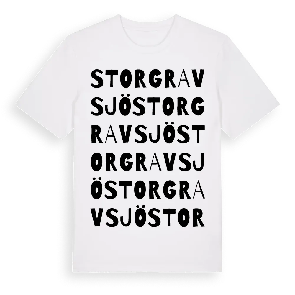 Storgravsjö ordlek t-shirt är inspirerad av Storgravsjö i Västerbottens län, Sverige. Tröjan är designad för dig som har en speciell koppling till platsen – oavsett om du bor här, har rötterna här eller bara älskar Storgravsjö.