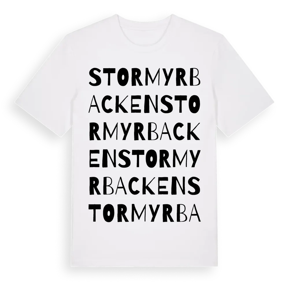 Stormyrbacken ordlek t-shirt är inspirerad av byn Stormyrbacken i Västerbottens län, Sverige. Tröjan är designad för dig som har en speciell koppling till platsen – oavsett om du bor här, har rötterna här eller bara älskar Stormyrbacken.