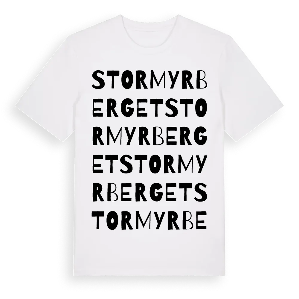 Stormyrberget ordlek t-shirt är inspirerad av Stormyrberget i Västerbottens län, Sverige. Tröjan är designad för dig som har en speciell koppling till platsen – oavsett om du bor här, har rötterna här eller bara älskar Stormyrberget.