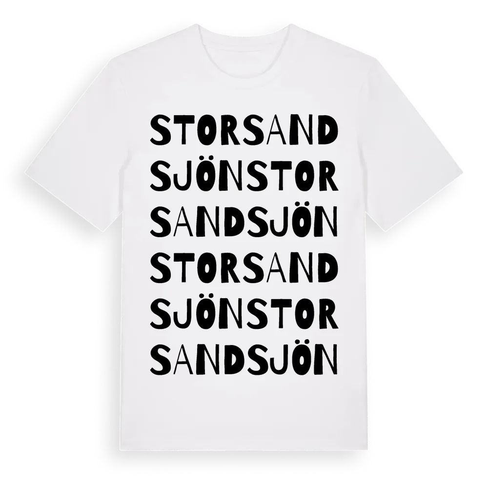 Storsandsjön ordlek t-shirt är inspirerad av byn Storsandsjön i Västerbottens län, Sverige. Tröjan är designad för dig som har en speciell koppling till platsen – oavsett om du bor här, har rötterna här eller bara älskar Storsandsjön.