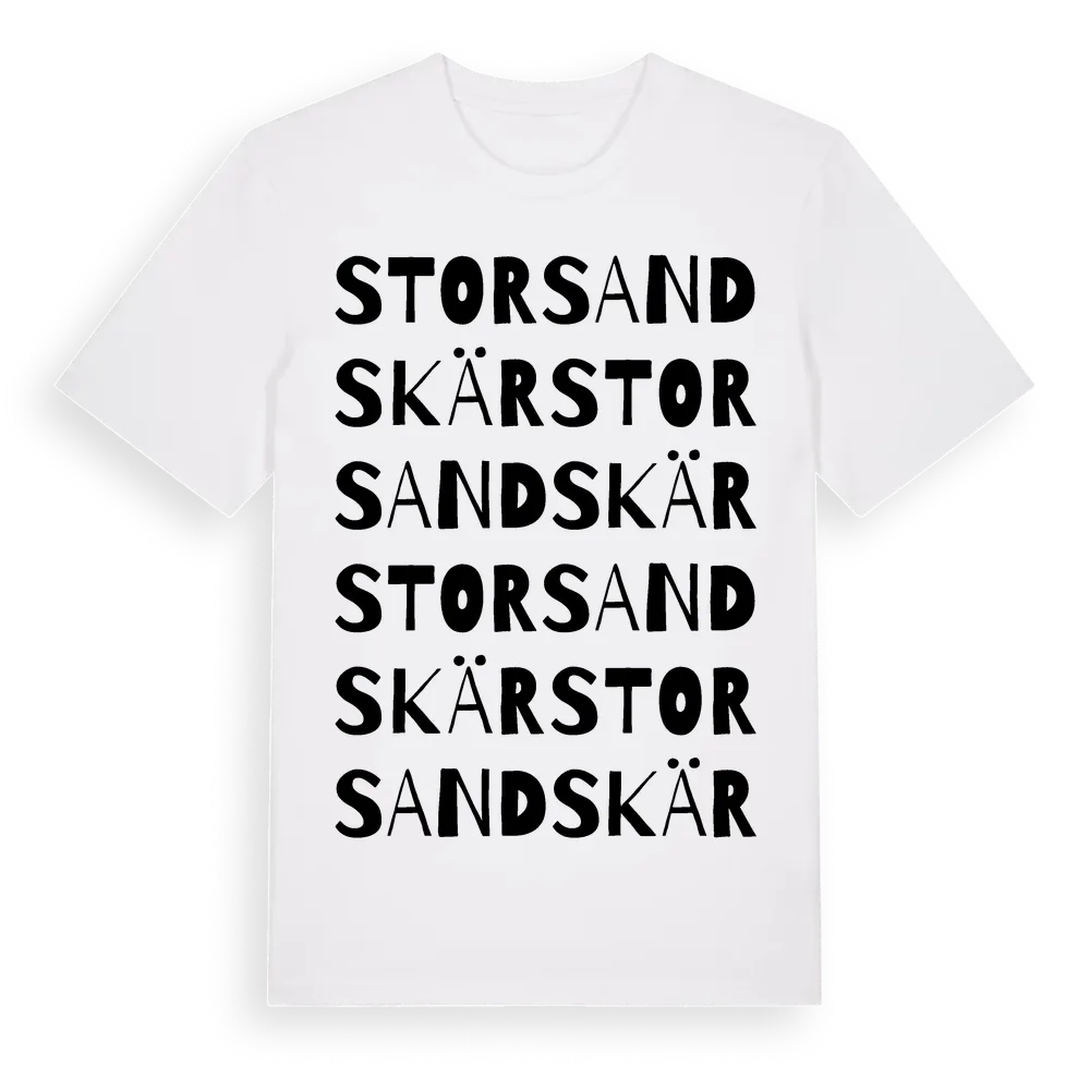Storsandskär ordlek t-shirt är inspirerad av ön Storsandskär i Västerbottens län, Sverige. Tröjan är designad för dig som har en speciell koppling till platsen – oavsett om du bor här, har rötterna här eller bara älskar Storsandskär.