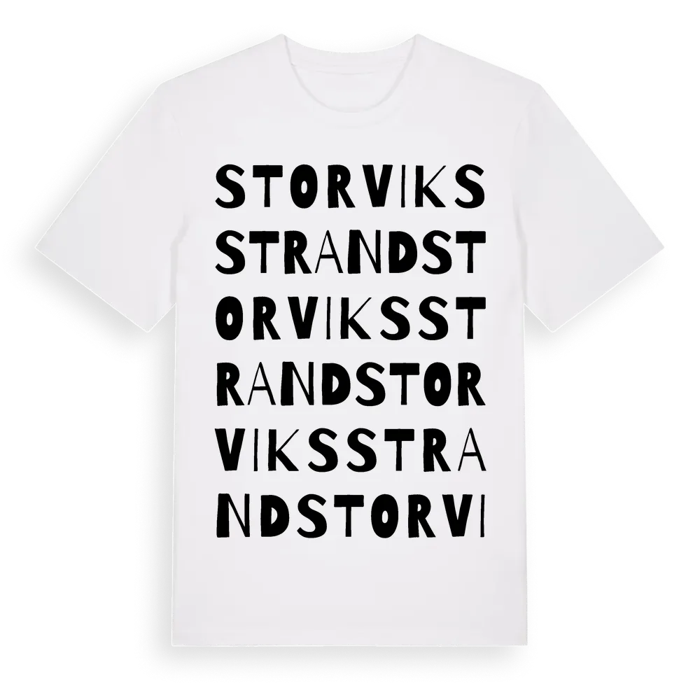 Storviksstrand ordlek t-shirt är inspirerad av byn Storviksstrand i Västerbottens län, Sverige. Tröjan är designad för dig som har en speciell koppling till platsen – oavsett om du bor här, har rötterna här eller bara älskar Storviksstrand.