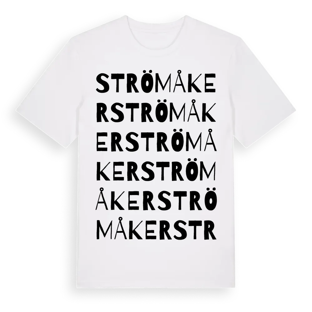Strömåker ordlek t-shirt är inspirerad av byn Strömåker i Västerbottens län, Sverige. Tröjan är designad för dig som har en speciell koppling till platsen – oavsett om du bor här, har rötterna här eller bara älskar Strömåker.