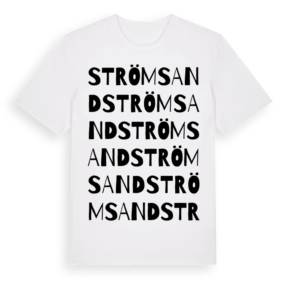 Strömsand ordlek t-shirt är inspirerad av Strömsand i Västerbottens län, Sverige. Tröjan är designad för dig som har en speciell koppling till platsen – oavsett om du bor här, har rötterna här eller bara älskar Strömsand.
