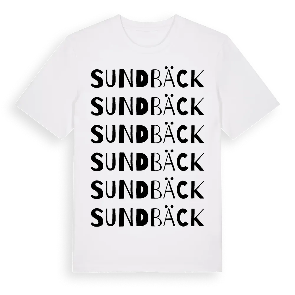 Sundbäck ordlek t-shirt är inspirerad av Sundbäck i Västerbottens län, Sverige. Tröjan är designad för dig som har en speciell koppling till platsen – oavsett om du bor här, har rötterna här eller bara älskar Sundbäck.