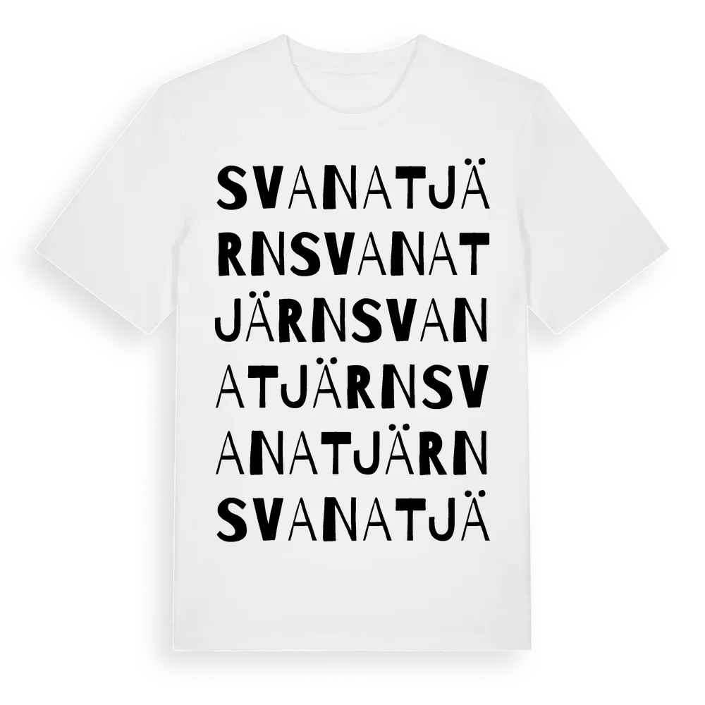 Svanatjärn ordlek t-shirt är inspirerad av Svanatjärn i Västerbottens län, Sverige. Tröjan är designad för dig som har en speciell koppling till platsen – oavsett om du bor här, har rötterna här eller bara älskar Svanatjärn.