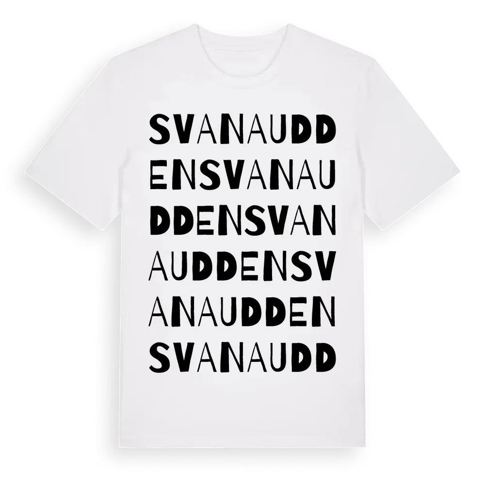 Svanaudden ordlek t-shirt är inspirerad av Svanaudden i Västerbottens län, Sverige. Tröjan är designad för dig som har en speciell koppling till platsen – oavsett om du bor här, har rötterna här eller bara älskar Svanaudden.