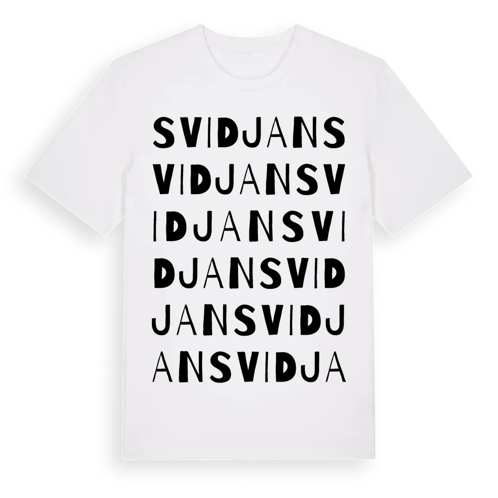 Svidjan ordlek t-shirt är inspirerad av byn Svidjan i Västerbottens län, Sverige. Tröjan är designad för dig som har en speciell koppling till platsen – oavsett om du bor här, har rötterna här eller bara älskar Svidjan.