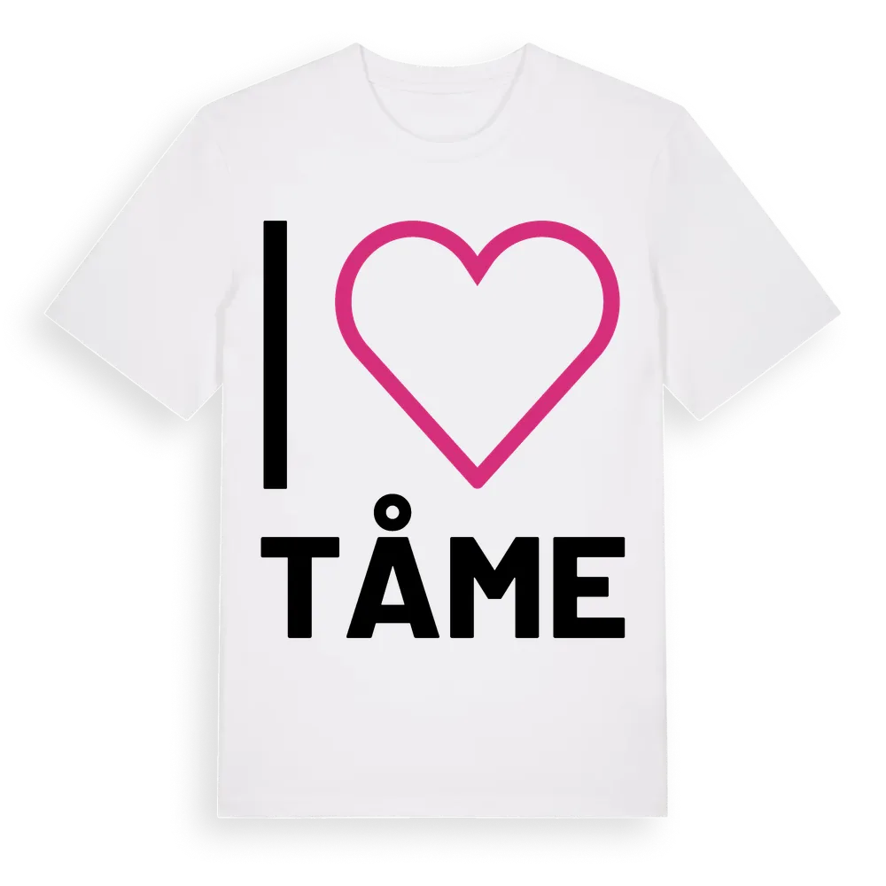 Jag älskar Tåme t-shirt stort tryck är inspirerad av byn Tåme i Västerbottens län, Sverige. Tröjan är designad för dig som har en speciell koppling till platsen – oavsett om du bor här, har rötterna här eller bara älskar Tåme.