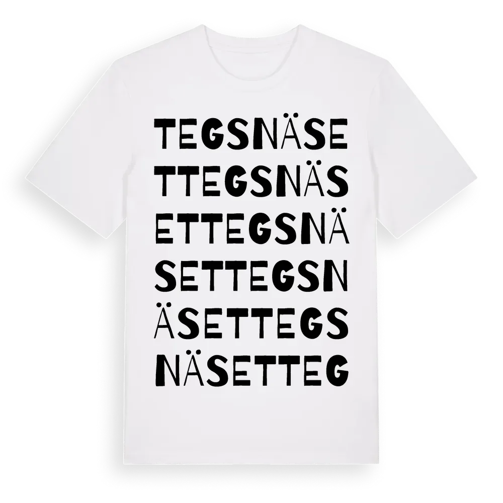 Tegsnäset ordlek t-shirt är inspirerad av byn Tegsnäset i Västerbottens län, Sverige. Tröjan är designad för dig som har en speciell koppling till platsen – oavsett om du bor här, har rötterna här eller bara älskar Tegsnäset.
