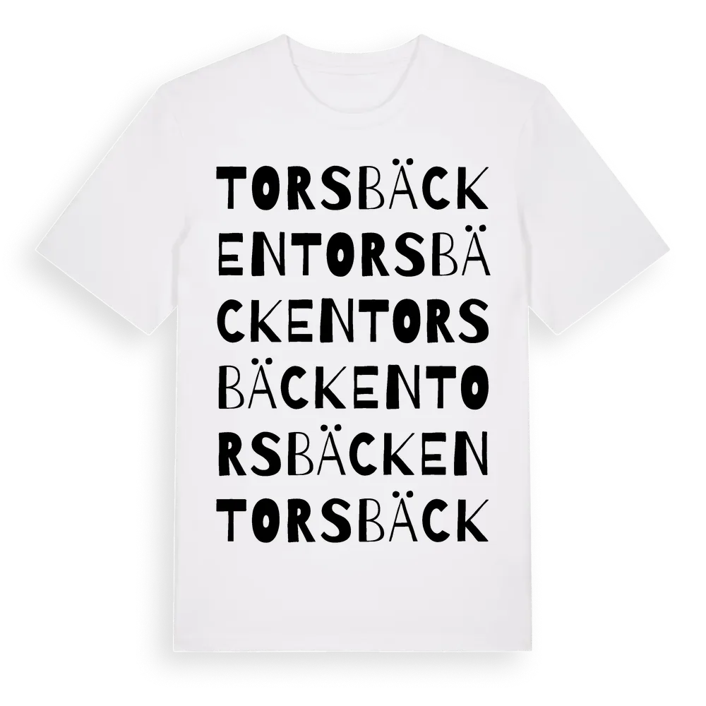Torsbäcken ordlek t-shirt är inspirerad av Torsbäcken i Västerbottens län, Sverige. Tröjan är designad för dig som har en speciell koppling till platsen – oavsett om du bor här, har rötterna här eller bara älskar Torsbäcken.
