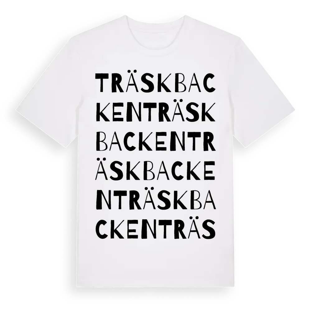 Träskbacken ordlek t-shirt är inspirerad av byn Träskbacken i Västerbottens län, Sverige. Tröjan är designad för dig som har en speciell koppling till platsen – oavsett om du bor här, har rötterna här eller bara älskar Träskbacken.