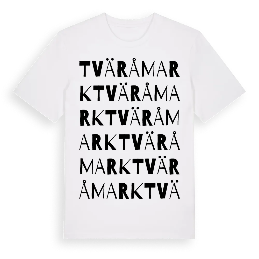 Tväråmark ordlek t-shirt är inspirerad av byn Tväråmark i Västerbottens län, Sverige. Tröjan är designad för dig som har en speciell koppling till platsen – oavsett om du bor här, har rötterna här eller bara älskar Tväråmark.