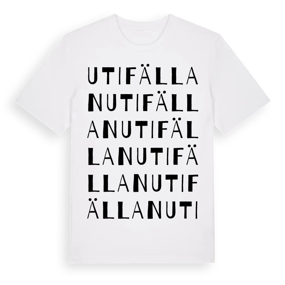 Utifällan ordlek t-shirt är inspirerad av byn Utifällan i Västerbottens län, Sverige. Tröjan är designad för dig som har en speciell koppling till platsen – oavsett om du bor här, har rötterna här eller bara älskar Utifällan.