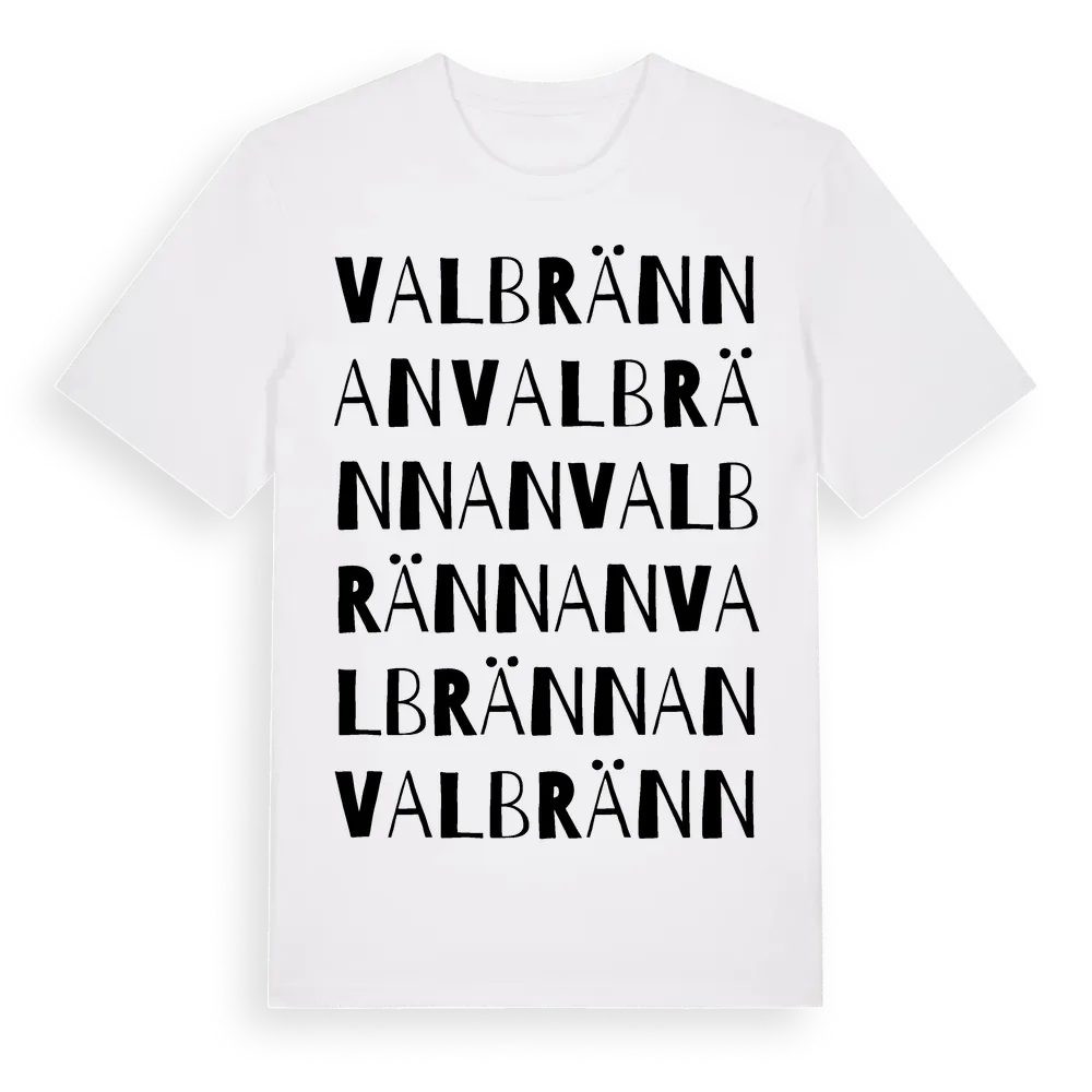 Valbrännan ordlek t-shirt är inspirerad av byn Valbrännan i Västerbottens län, Sverige. Tröjan är designad för dig som har en speciell koppling till platsen – oavsett om du bor här, har rötterna här eller bara älskar Valbrännan.