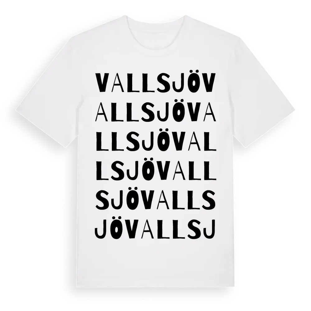 Vallsjö ordlek t-shirt är inspirerad av Vallsjö i Västerbottens län, Sverige. Tröjan är designad för dig som har en speciell koppling till platsen – oavsett om du bor här, har rötterna här eller bara älskar Vallsjö.
