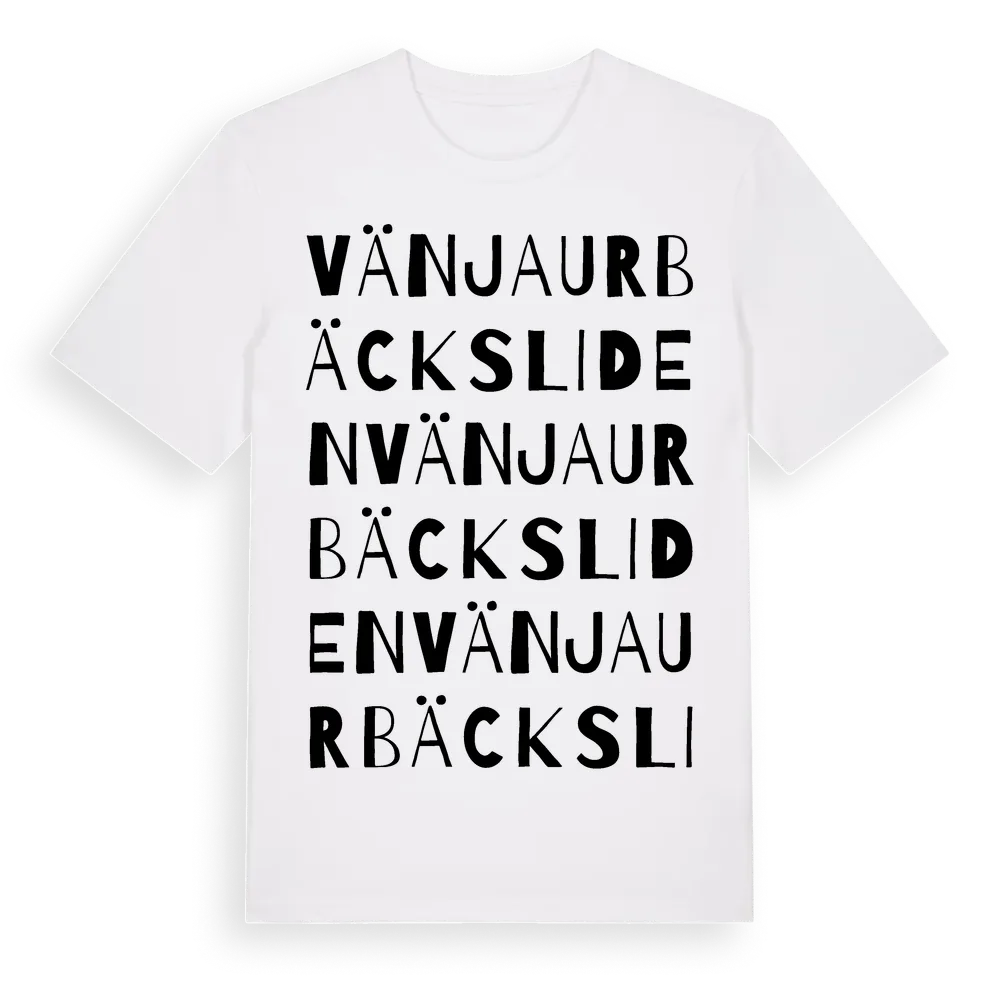 Vänjaurbäcksliden ordlek t-shirt är inspirerad av Vänjaurbäcksliden i Västerbottens län, Sverige. Tröjan är designad för dig som har en speciell koppling till platsen – oavsett om du bor här, har rötterna här eller bara älskar Vänjaurbäcksliden.