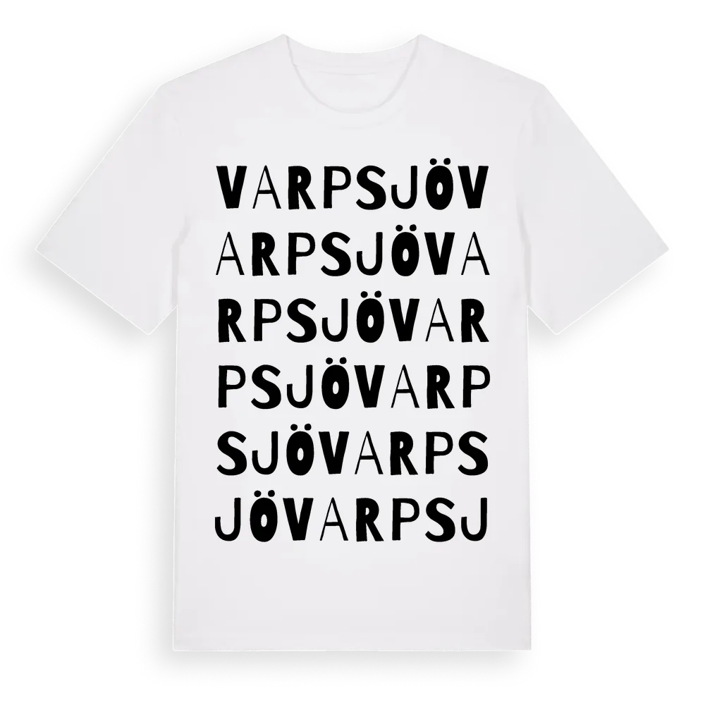 Varpsjö ordlek t-shirt är inspirerad av byn Varpsjö i Västerbottens län, Sverige. Tröjan är designad för dig som har en speciell koppling till platsen – oavsett om du bor här, har rötterna här eller bara älskar Varpsjö.