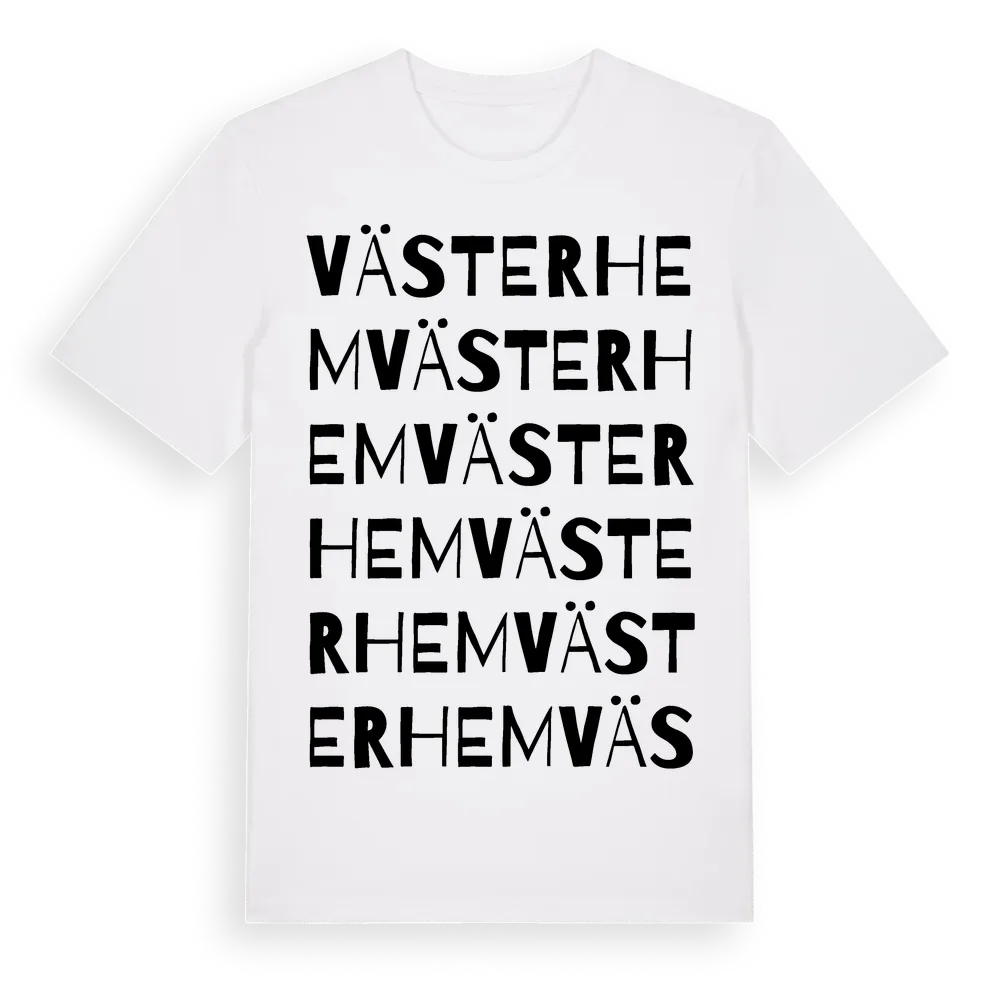 Västerhem ordlek t-shirt är inspirerad av Västerhem i Västerbottens län, Sverige. Tröjan är designad för dig som har en speciell koppling till platsen – oavsett om du bor här, har rötterna här eller bara älskar Västerhem.