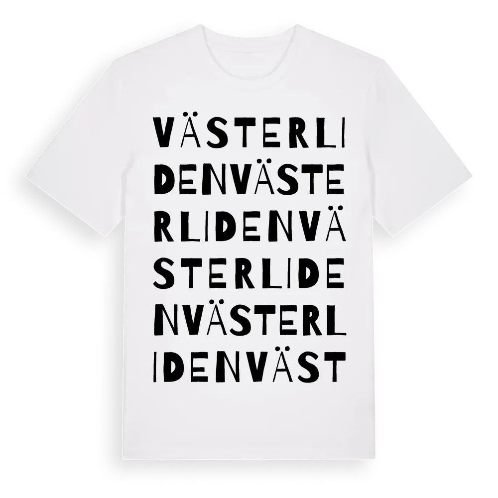 Västerliden ordlek t-shirt är inspirerad av Västerliden i Västerbottens län, Sverige. Tröjan är designad för dig som har en speciell koppling till platsen – oavsett om du bor här, har rötterna här eller bara älskar Västerliden.