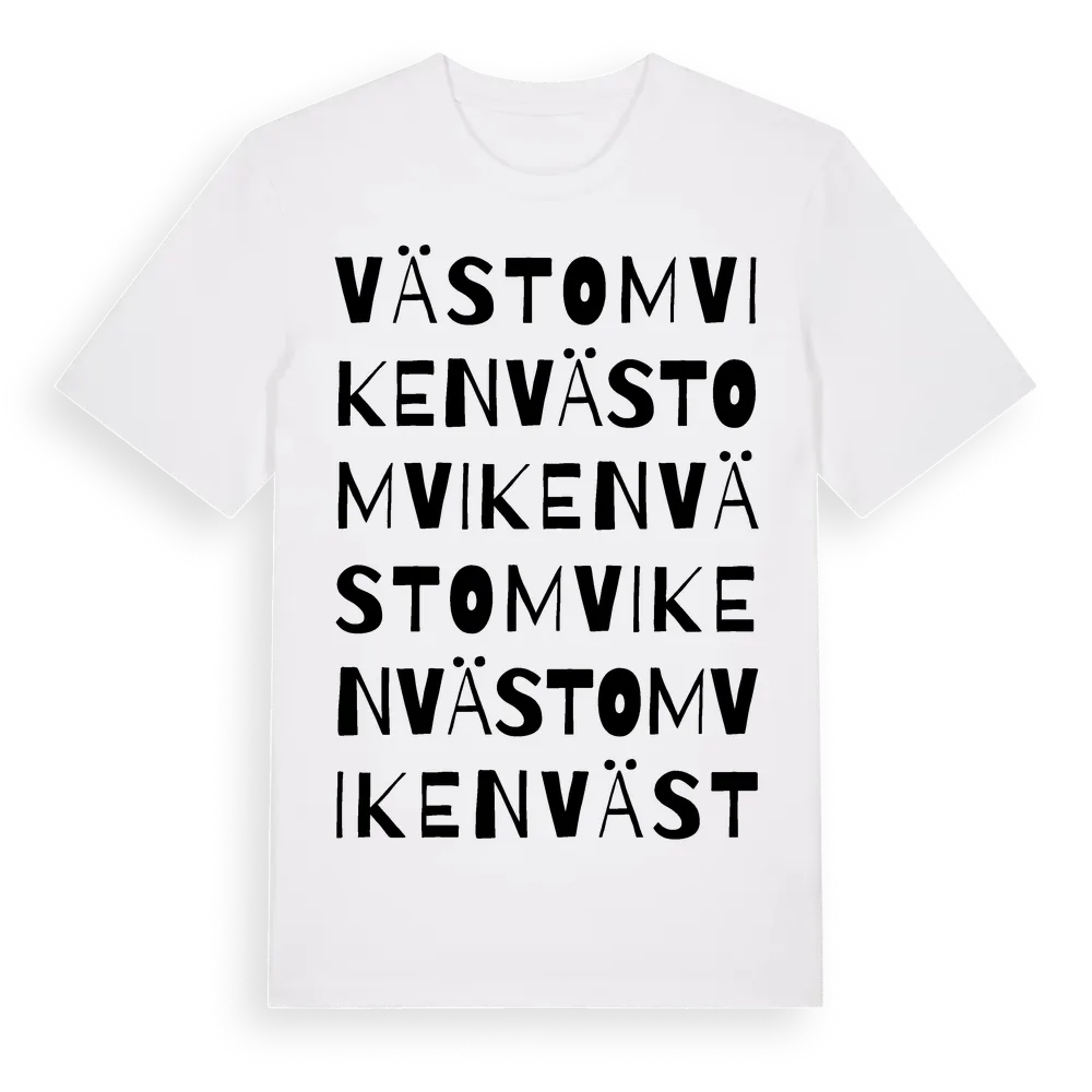 Västomviken ordlek t-shirt är inspirerad av byn Västomviken i Västerbottens län, Sverige. Tröjan är designad för dig som har en speciell koppling till platsen – oavsett om du bor här, har rötterna här eller bara älskar Västomviken.