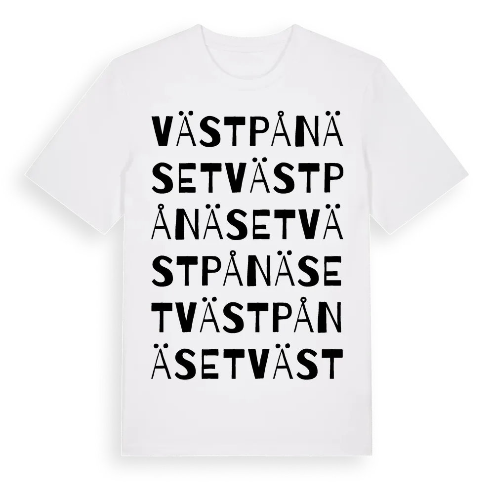 Västpånäset ordlek t-shirt är inspirerad av Västpånäset i Västerbottens län, Sverige. Tröjan är designad för dig som har en speciell koppling till platsen – oavsett om du bor här, har rötterna här eller bara älskar Västpånäset.