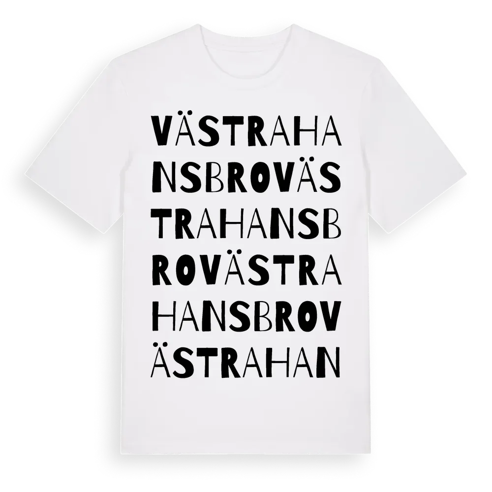 Västra Hansbro ordlek t-shirt är inspirerad av Västra Hansbro i Västerbottens län, Sverige. Tröjan är designad för dig som har en speciell koppling till platsen – oavsett om du bor här, har rötterna här eller bara älskar Västra Hansbro.