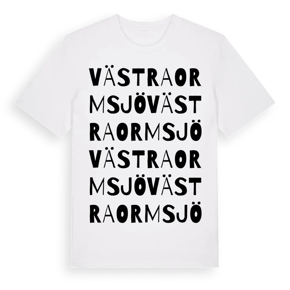 Västra Ormsjö ordlek t-shirt är inspirerad av byn Västra Ormsjö i Västerbottens län, Sverige. Tröjan är designad för dig som har en speciell koppling till platsen – oavsett om du bor här, har rötterna här eller bara älskar Västra Ormsjö.