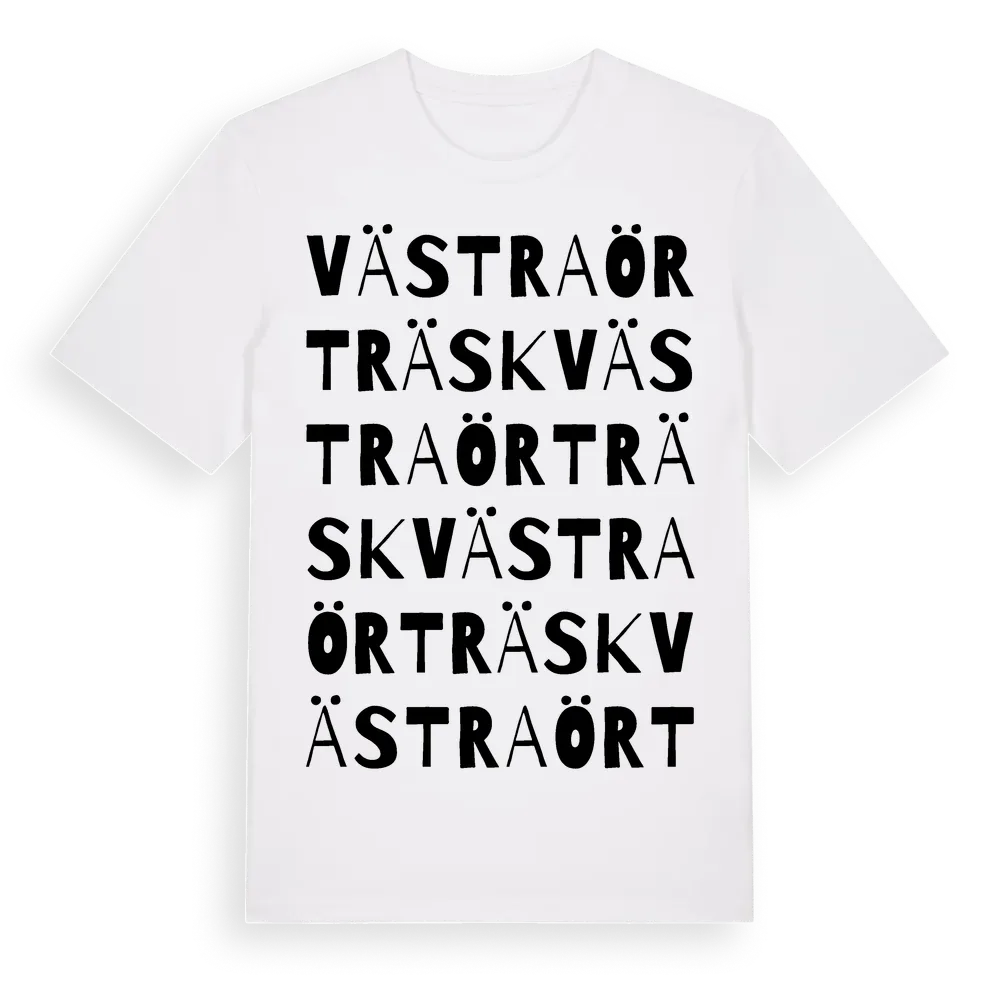 Västra Örträsk ordlek t-shirt är inspirerad av byn Västra Örträsk i Västerbottens län, Sverige. Tröjan är designad för dig som har en speciell koppling till platsen – oavsett om du bor här, har rötterna här eller bara älskar Västra Örträsk.