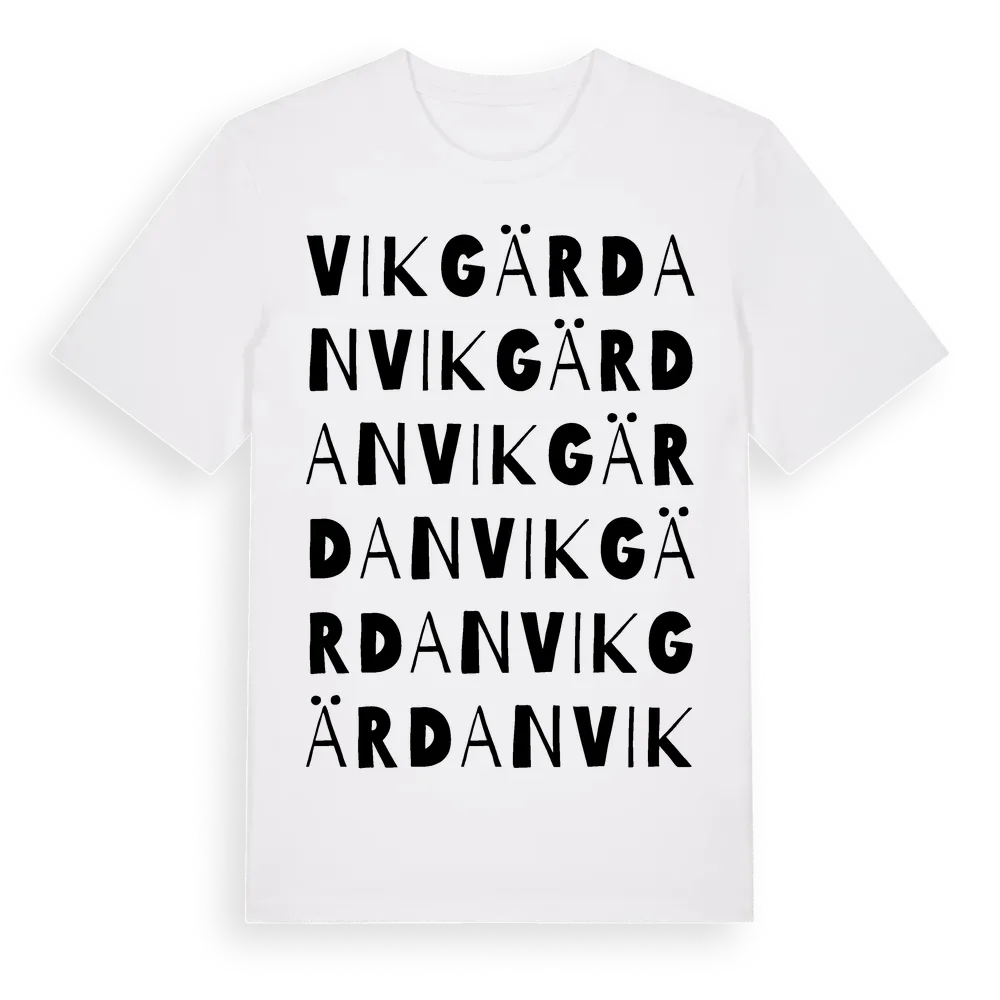 Vikgärdan ordlek t-shirt är inspirerad av Vikgärdan i Västerbottens län, Sverige. Tröjan är designad för dig som har en speciell koppling till platsen – oavsett om du bor här, har rötterna här eller bara älskar Vikgärdan.