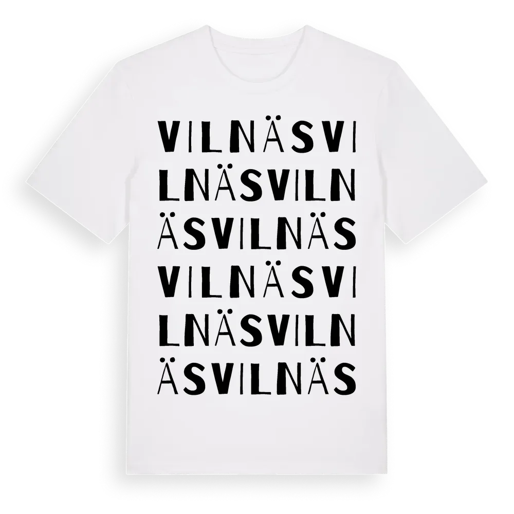 Vilnäs ordlek t-shirt är inspirerad av Vilnäs i Västerbottens län, Sverige. Tröjan är designad för dig som har en speciell koppling till platsen – oavsett om du bor här, har rötterna här eller bara älskar Vilnäs.