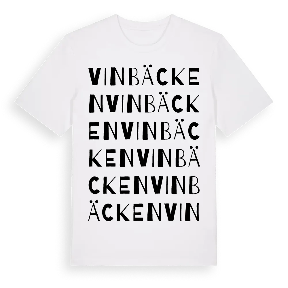 Vinbäcken ordlek t-shirt är inspirerad av Vinbäcken i Västerbottens län, Sverige. Tröjan är designad för dig som har en speciell koppling till platsen – oavsett om du bor här, har rötterna här eller bara älskar Vinbäcken.