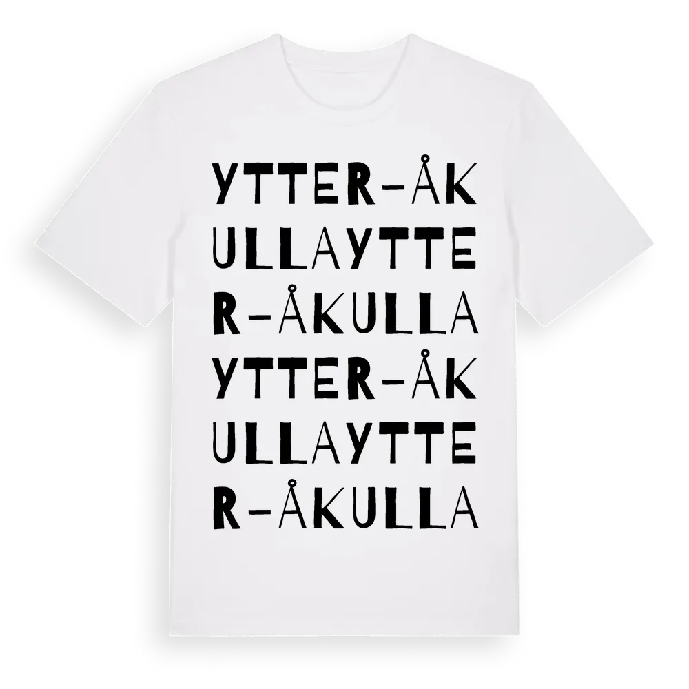 Ytter-Åkulla ordlek t-shirt är inspirerad av byn Ytter-Åkulla i Västerbottens län, Sverige. Tröjan är designad för dig som har en speciell koppling till platsen – oavsett om du bor här, har rötterna här eller bara älskar Ytter-Åkulla.