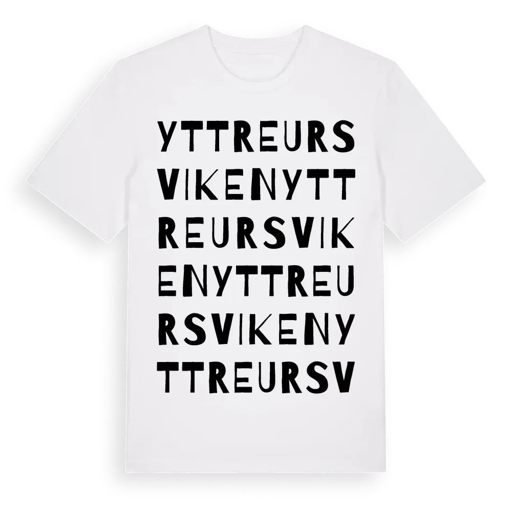 Yttre Ursviken ordlek t-shirt är inspirerad av byn Yttre Ursviken i Västerbottens län, Sverige. Tröjan är designad för dig som har en speciell koppling till platsen – oavsett om du bor här, har rötterna här eller bara älskar Yttre Ursviken.