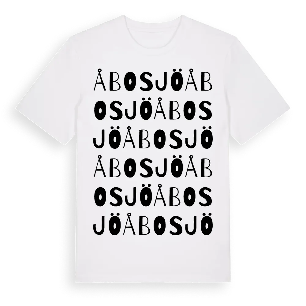 Åbosjö ordlek t-shirt är inspirerad av byn Åbosjö i Västernorrlands län, Sverige. Tröjan är designad för dig som har en speciell koppling till platsen – oavsett om du bor här, har rötterna här eller bara älskar Åbosjö.