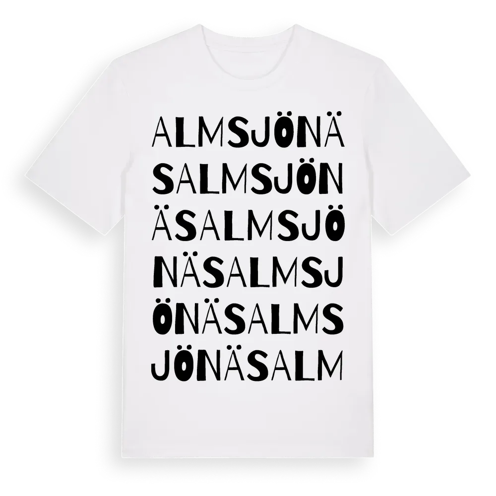 Almsjönäs ordlek t-shirt är inspirerad av byn Almsjönäs i Västernorrlands län, Sverige. Tröjan är designad för dig som har en speciell koppling till platsen – oavsett om du bor här, har rötterna här eller bara älskar Almsjönäs.