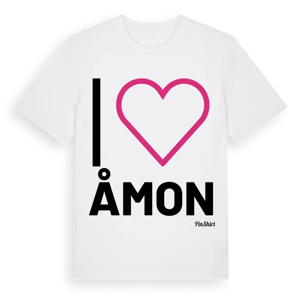 Jag älskar Åmon t-shirt stort tryck är inspirerad av byn Åmon i Västernorrlands län, Sverige. Tröjan är designad för dig som har en speciell koppling till platsen – oavsett om du bor här, har rötterna här eller bara älskar Åmon.