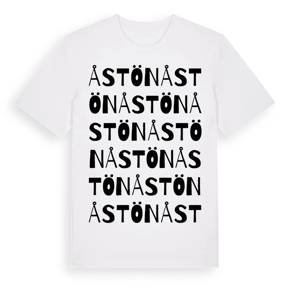 Åstön ordlek t-shirt är inspirerad av ön Åstön i Västernorrlands län, Sverige. Tröjan är designad för dig som har en speciell koppling till platsen – oavsett om du bor här, har rötterna här eller bara älskar Åstön.