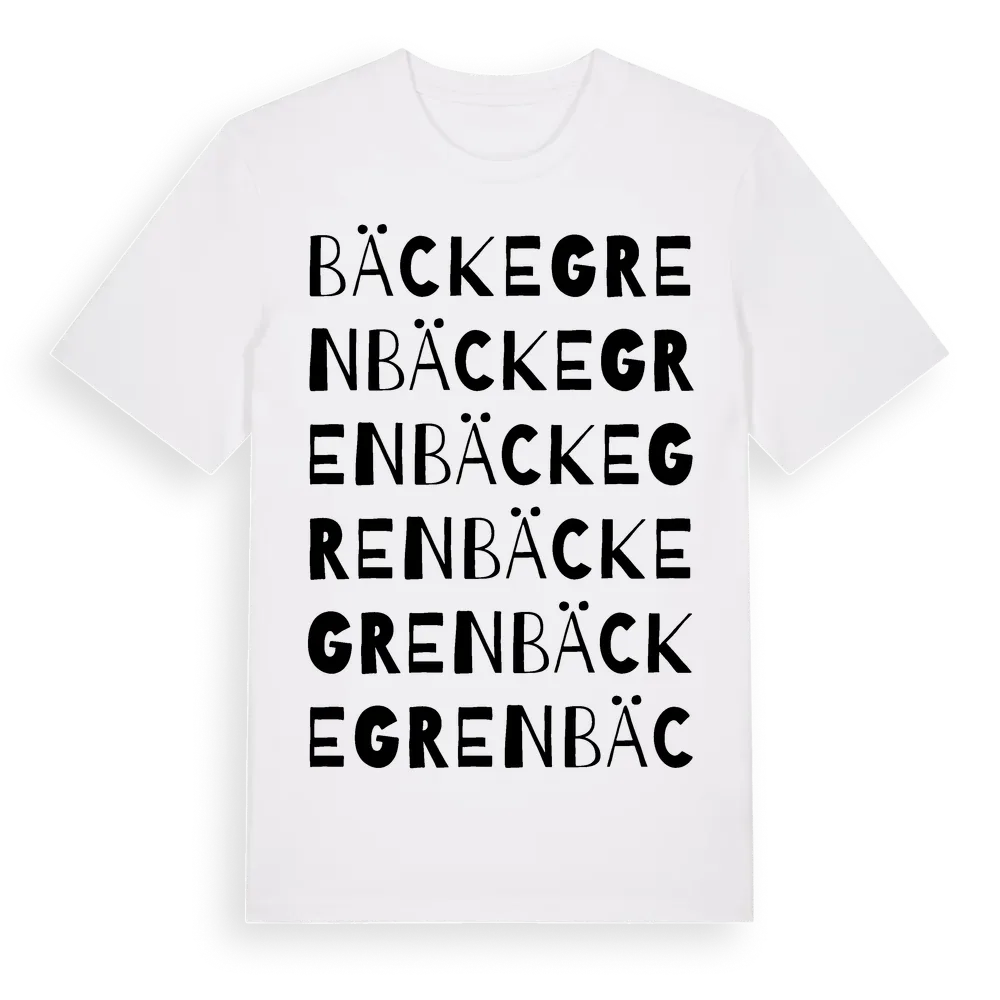 Bäckegren ordlek t-shirt är inspirerad av byn Bäckegren i Västernorrlands län, Sverige. Tröjan är designad för dig som har en speciell koppling till platsen – oavsett om du bor här, har rötterna här eller bara älskar Bäckegren.