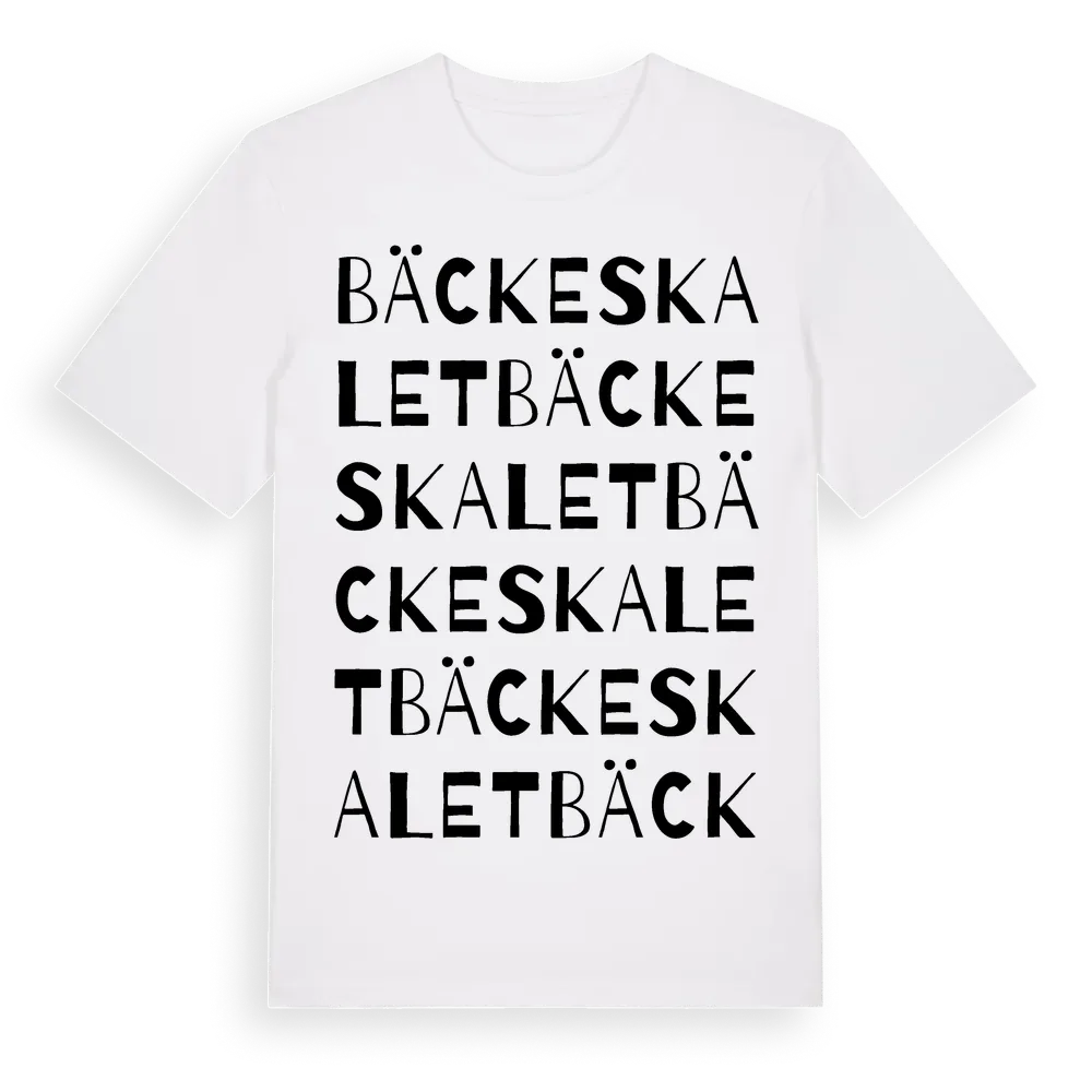 Bäckeskalet ordlek t-shirt är inspirerad av Bäckeskalet i Västernorrlands län, Sverige. Tröjan är designad för dig som har en speciell koppling till platsen – oavsett om du bor här, har rötterna här eller bara älskar Bäckeskalet.
