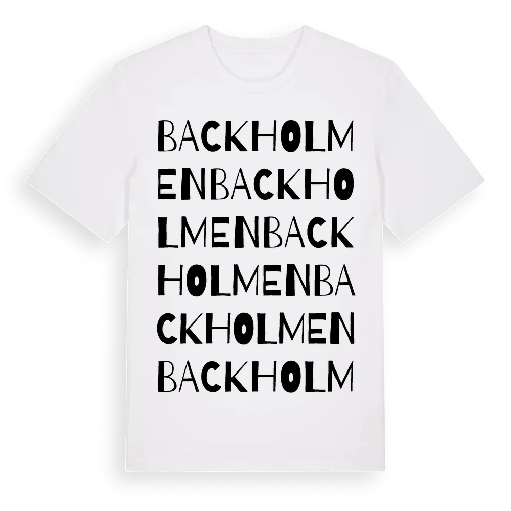 Backholmen ordlek t-shirt är inspirerad av Backholmen i Västernorrlands län, Sverige. Tröjan är designad för dig som har en speciell koppling till platsen – oavsett om du bor här, har rötterna här eller bara älskar Backholmen.