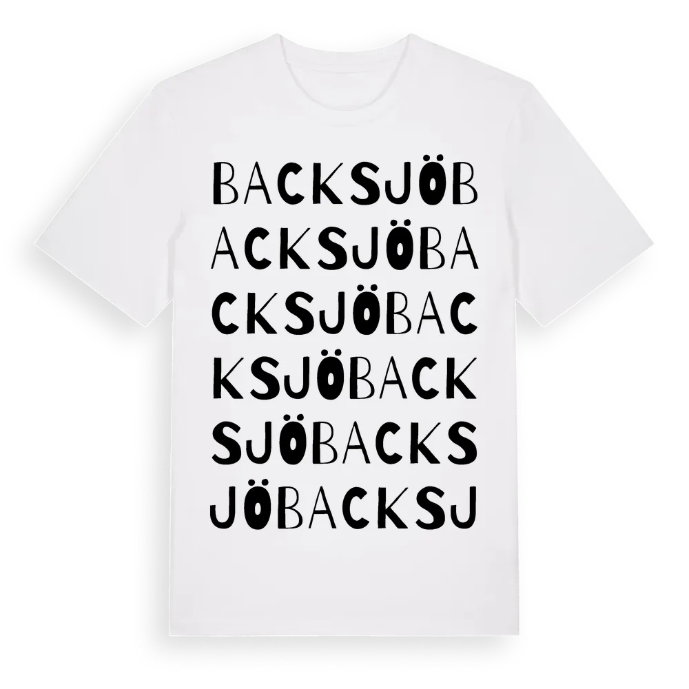 Backsjö ordlek t-shirt är inspirerad av byn Backsjö i Västernorrlands län, Sverige. Tröjan är designad för dig som har en speciell koppling till platsen – oavsett om du bor här, har rötterna här eller bara älskar Backsjö.