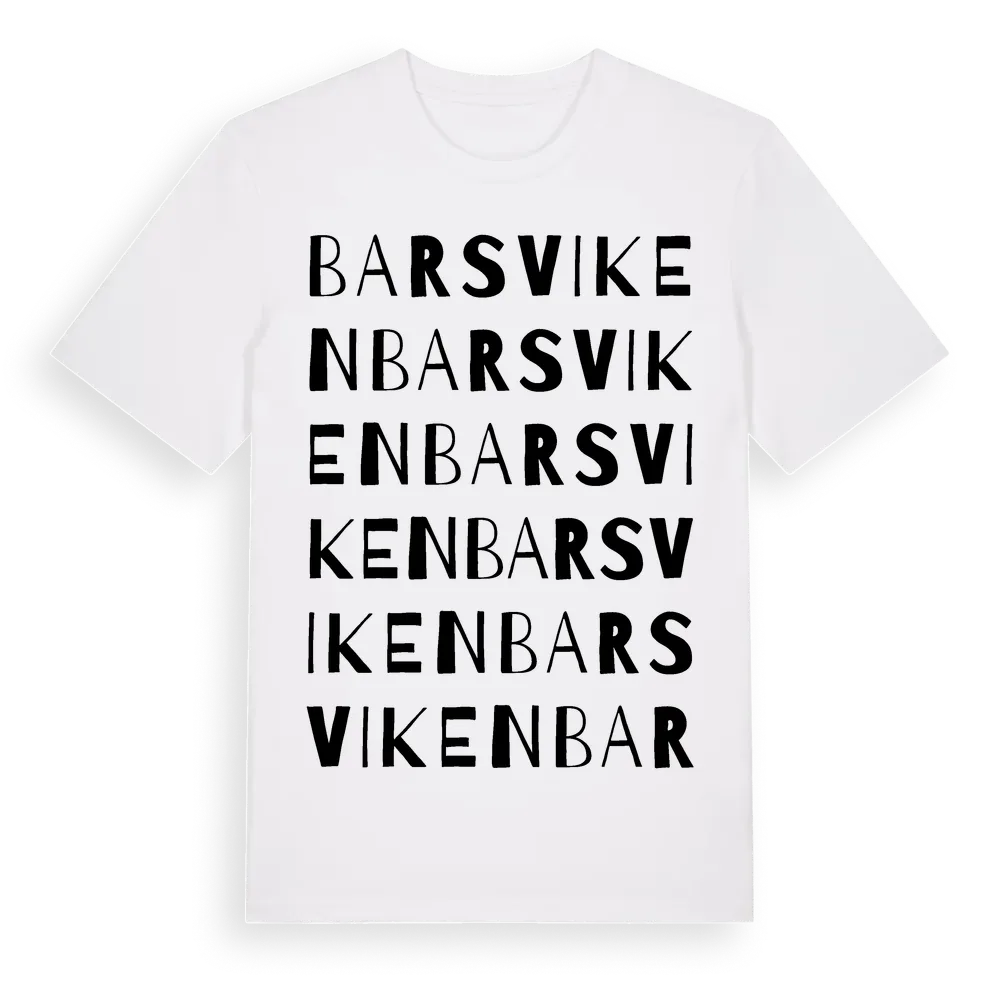 Barsviken ordlek t-shirt är inspirerad av byn Barsviken i Västernorrlands län, Sverige. Tröjan är designad för dig som har en speciell koppling till platsen – oavsett om du bor här, har rötterna här eller bara älskar Barsviken.