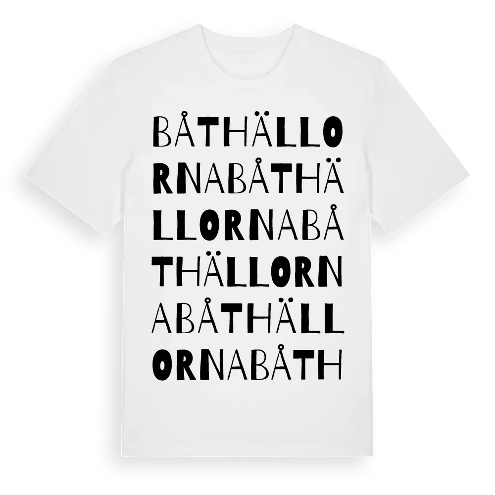 Båthällorna ordlek t-shirt är inspirerad av Båthällorna i Västernorrlands län, Sverige. Tröjan är designad för dig som har en speciell koppling till platsen – oavsett om du bor här, har rötterna här eller bara älskar Båthällorna.