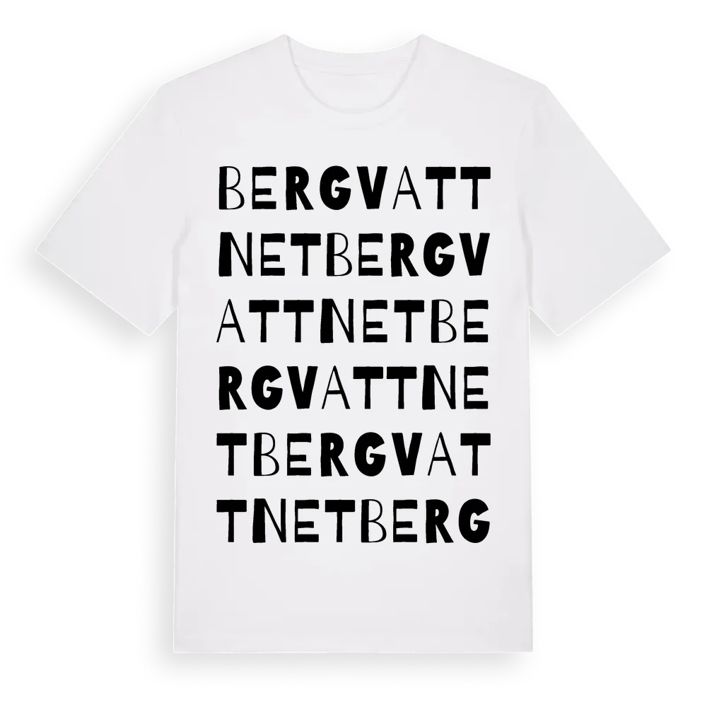 Bergvattnet ordlek t-shirt är inspirerad av byn Bergvattnet i Västernorrlands län, Sverige. Tröjan är designad för dig som har en speciell koppling till platsen – oavsett om du bor här, har rötterna här eller bara älskar Bergvattnet.