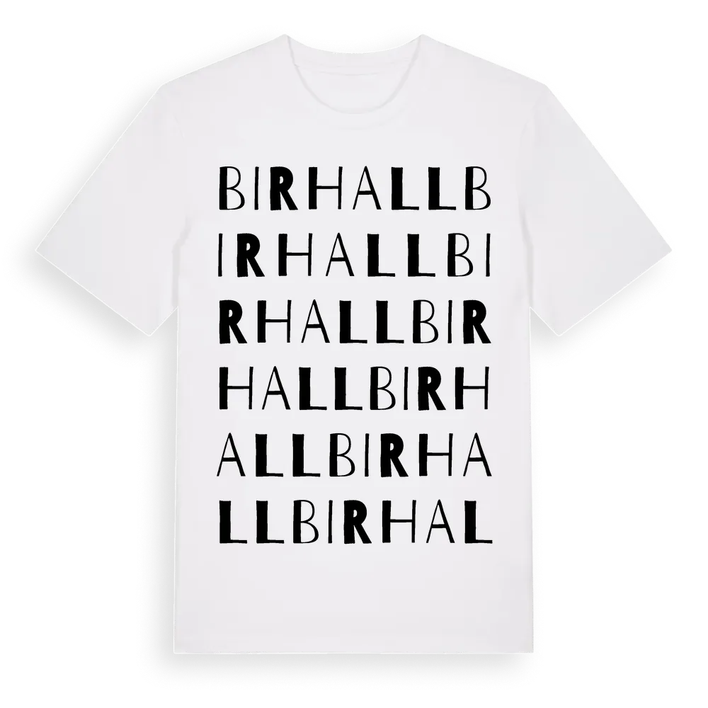Birhall ordlek t-shirt är inspirerad av byn Birhall i Västernorrlands län, Sverige. Tröjan är designad för dig som har en speciell koppling till platsen – oavsett om du bor här, har rötterna här eller bara älskar Birhall.